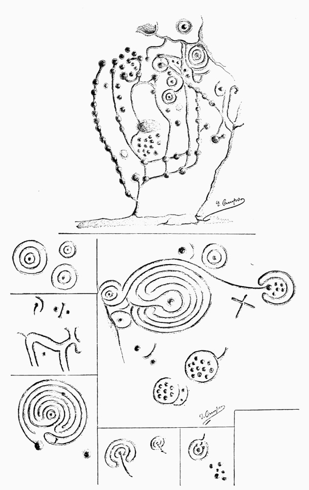 In Galicia, barrows, locally known as castros, are very numerous. On one occasion four were pointed out to me during an hour’s drive. As Señor Villa Amil has remarked, they are too well fortified to be temples, and too numerous and too near together to be war camps. During the Middle Ages the Gallegans used them as forts; and earlier still, when defending themselves against the Romans, they made them their chief strongholds. These castros are frequently mentioned in the Historia Compostelana, and always as fortresses. Señor Villa Amil concludes that they must have originally been, at one and the same time, both fortresses and towns. Strabo’s statement that the Celts lived in little villages close to one another supports this view. Some authors, taking the accessary for the principal, have called these castros, mamoas, or modorras; but mamoas are, in fact, what archæologists have agreed to call tumuli. In the old Latin documents of Galicia these last are called mamulas and mamonas. The most important articles found in these mamoas are the so-called{7} torcs, or torques, of massive gold, with coarse workmanship and very little ornamentation. Señor Villa Amil explains the paucity of iron instruments by the climatic conditions of the country, which he thinks lead to the total decomposition of iron weapons. Handmills of two pieces of granite have been found, very similar to those discovered in French caves. Though he has found many fragments of pottery, Señor Villa Amil has never come across a whole vase, and he takes this as a proof that the people who formed these tumuli could not have used funeral urns; the fragments are in almost every case of a material which gives them an undoubtedly historic character—they are of clay mixed with sand and scattered over with mica. Some iron instruments and some bronze jewellery, more finely worked than the gold torques, were found with these. Our friend concludes that the tumuli must be prehistoric citadels which continued to be used as fastnesses right down to the end of the Middle Ages. Melida states that on all the mamoas of Galicia there have been found indications of the cremation of the dead. Señor Macineira has prepared a map of the castros in the neighbourhood of Ortigueira (Galicia), showing which of them he considers to be of ante-Roman and which of Roman origin,[13] those of Roman origin being similar to our “Cæsar’s camps.” Many of them served as defences of the coast. They are oblong or circular in shape with double parapets, often showing that much thought must have been expended upon their construction. It is supposed that the ante-Roman ones were used as the residences of tribal chiefs as well as for sepulchres, while Druidical stones resembling those of Stonehenge are to be seen in several wild and mountainous spots, and huge heaps of stones like the cairns of Scotland and Ireland also testify to Celtic customs. Galicia certainly rivals the British Isles in her megalithic remains; she can also boast of “rocking” boulders[14] such as those that were formerly used as tests of female virtue in Brittany. That Celts inhabited Galicia at a very early period in the history of the human race is certain, but they were not her earliest inhabitants. Barros Sivelo was convinced, after years of study, that the earliest inhabitants of Galicia were neither Celts nor Iberians. To discover who were the forerunners of these two races will be the business of archæology, and in archæology the words “prehistoric” and “historic” cease to have any value, for every object that comes{8} down to us from the earliest times is itself a historical document, which, if properly interpreted, will help to throw light upon the past.