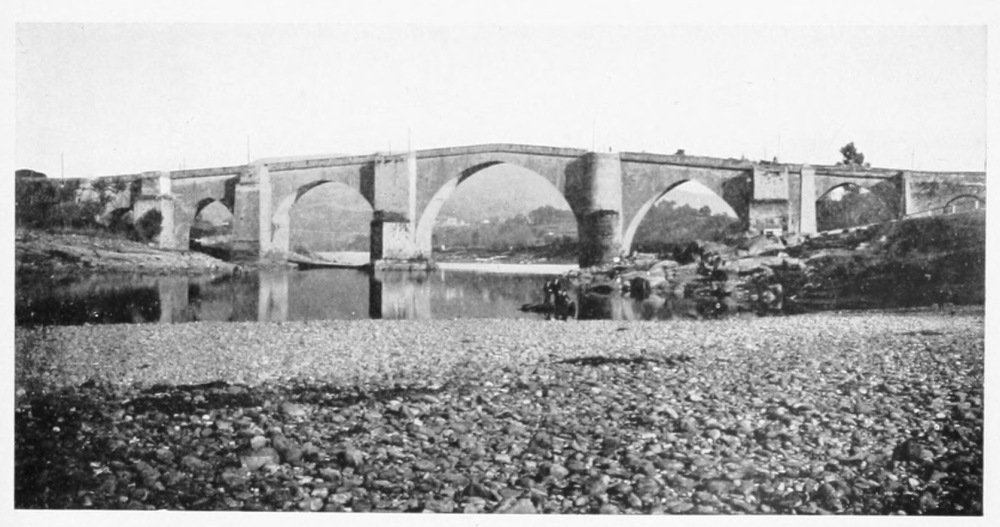 Another of Galicia’s rivers, the Miño, is one of the six largest rivers in Spain. Its present name was given to it by the Romans; it is a Latin word meaning vermilion,[37] and was chosen on account of the metallic yellow its waters left upon their banks. St. Isidore and Justin both give this explanation of the name. Pliny says its mouth was four (Roman) miles wide, and Strabo adds that it was navigable for a distance of about eight hundred stadia. In the present day it is not navigable for even half that distance—“a great loss,” remarks Florez, “to commerce.” Florez, however, is convinced that the ancients called by the name of Miño the river that is now called the Sil—because the Sil is the river whose banks receive the vermilion. Orosius, moreover, speaks of Monte Medulio as situated above the Miño, whereas it is now above the Sil, at the point where that river enters Galicia, and the earth there is said to be of a reddish hue. Besides, the Sil runs into the sea, receiving the waters of many other streams, but it does not flow into any river. Molina, however, whose description of Galicia was first published in 1550, goes still further, and says he is sure the Gallegans changed the names of the two rivers because the Sil was a foreign river, rising outside Galicia, whereas the Miño was a native! Molina believed that the Miño got its name from Miñan, the spring which is its source. The Miño rises near the town of Lugo,{22} flows through the province of Orense, and, while forming the natural boundary between Galicia and Portugal, flows into the Atlantic a little beyond the town of Tuy. The beauty of the scenery through which the Miño passes after it has left the town of Orense is hardly to be surpassed in the whole of Spain.