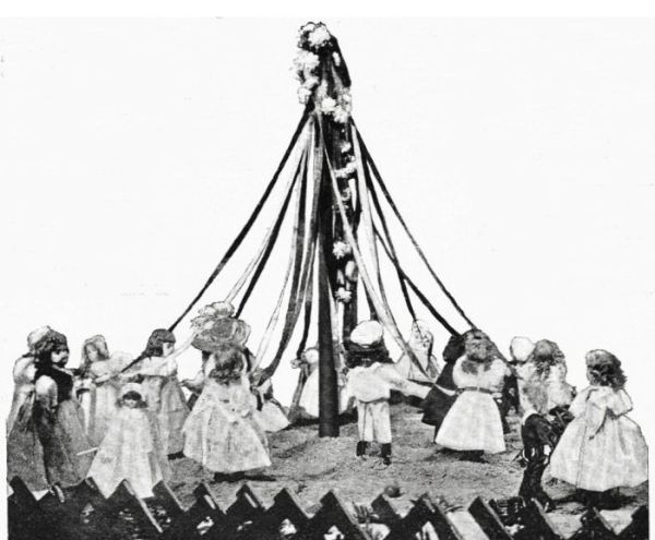 One of the gayest groups was arranged on a raised platform in the centre of the hall. This was the Maypole dance, where, holding the ends of bright ribbons, merry-faced dolls danced about two Maypoles, which were festooned with flowers. "How natural!" was the exclamation of each spectator, while the dolls in the balcony looked down on this group as if envying them their good time, and wishing themselves in their places.