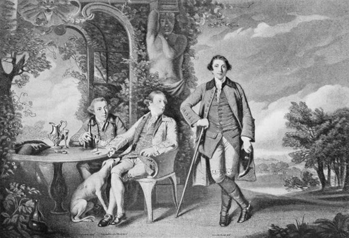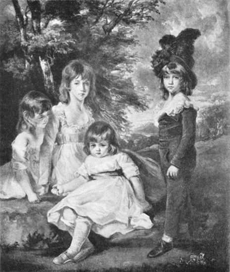 In 1775, Sir Joshua had passed the zenith of his fame, though he lived until 1792. Gainsborough, who was established in a studio in Schomberg House, Pall Mall, was in 1775 at the beginning of his most successful years; his rooms were crowded with sitters of both sexes, and no one considered they had proved their position in society until they had received the hall-mark of being painted by him. He was only sixty-one at his death in 1788. Romney, who lived to 1802, never took quite the same rank as the other two, yet he was popular enough at the same time as Gainsborough; Lady Newdigate (The Cheverels of Cheverel Manor) mentions going to have her portrait painted by him, and says that “he insists upon my having a rich white satin with a long train made by Tuesday, and to have it left with him all the summer. It is the oddest thing I ever knew.” Sir Thomas Lawrence and Hoppner carried on the traditions of the portrait painters, the former living to 1830; with names such as these it is easy to judge art was in a flourishing condition.