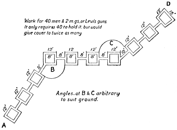 Pull knife-rests2 down into the trench D E F, also throw wire into it if available. At once put a couple of men at the point D to cover the trench D E with their rifles. As soon as you are able to do so, dig a short trench from G to D and place a Lewis gun at G to enfilade D E. You may have to wait until after dark before you 6869actually carry this out, but you should make arrangements for doing it by daylight. It would not be a bad plan to tie a few tins on to the knife-rests which you have thrown into the trench, so that the rattle, if they are moved, will give you warning of any one’s approach. The Lewis gun at G will be practically out of bombing range from E F.