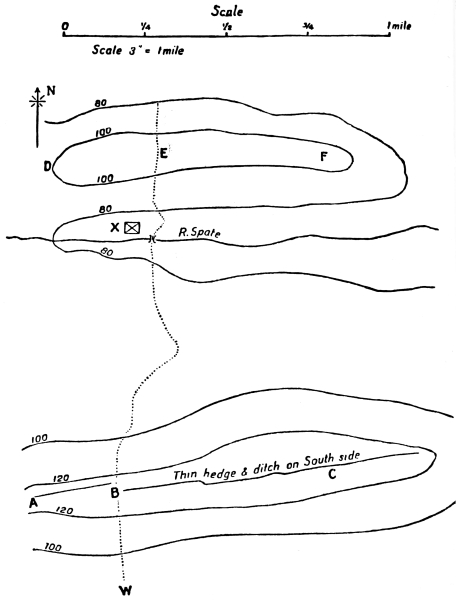 You are in command of a company and are marching in a northerly direction along the road W B E, with scouts in front of you. On reaching the top of the ridge at B your scouts halt and beckon to you. You go forward and see what appears to be an enemy’s battalion at X, by the bank of the River Spate. The battalion is in close column and the men are lying down resting. The country all round the battalion is open. There is a thin hedge on the top of the ridge A B C through which you can see and60 through which you could fire, but which gives you cover from view.