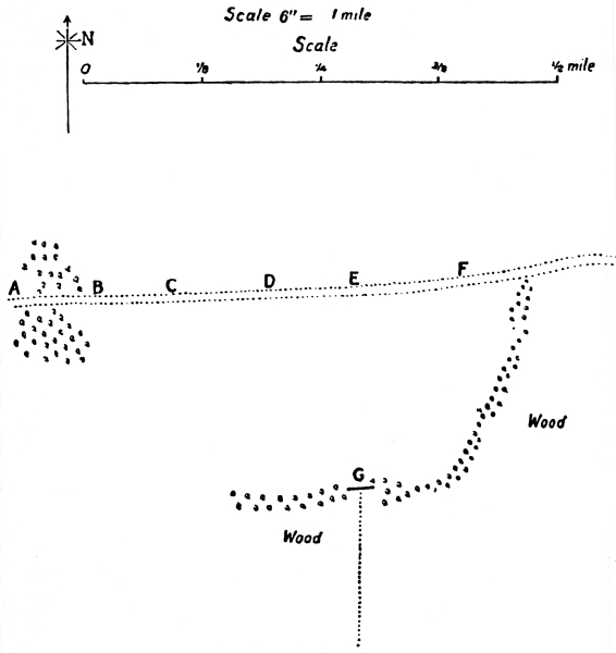 The force to which you belong has made a night march. Your platoon now forms part of a new outpost line. You halted in a ditch at line marked D, with a thin hedge on the enemy’s side of it, which gives you good cover from view. Your idea was to use this place as the headquarters of your picket, and as soon as it was thoroughly light to throw groups out in front. Your platoon consists of forty men and a Lewis gun. Soon after dawn and when your men are still in the trench at D, you see what you take to be a strong platoon of the enemy advancing straight towards you from the north; a couple of groups of men are fifty yards in front, and the remainder of the platoon is advancing in fours along a country road, which passes close54 to your position. You see the platoon when it is at A about 1,000 yards off.