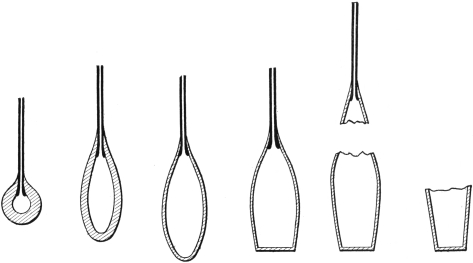Thermal expansion is a vital factor in yet another of the uses of glass. Our ordinary instrument for measuring temperature—the mercury thermometer—is very considerably affected by the expansive behaviour of glass. When a mercury thermometer is warmed the mercury column rises in the stem because the mercury expands upon warming to a greater extent than the glass vessel, bulb and stem, in which it is contained. The subject of the graduations and corrections of the mercury glass thermometer is a very large one and somewhat outside the scope of the present volume; but attention should be drawn in this place to the peculiarities of the behaviour of glass that have been discovered in this connection. One of these is that when first blown the bulb of a thermometer takes a very considerable time to acquire its final volume, the result being, that if a freshly made thermometer is graduated, after some time the zero of the instrument will be found considerably changed, generally in a direction which indicates that the volume of the bulb has slightly increased. By a special annealing or “ageing” process this change can be completed in a comparatively short time before the instrument is graduated. There is, however, a further peculiarity which is prominent in some thermometers, although very greatly reduced in the best modern glasses.29 This becomes apparent in a decided change of zero whenever the thermometer has been exposed for any length of time to a high temperature, the zero gradually returning more or less to its original position in the course of time. With thermometers made of glasses liable to these aberrations, the reading for a given temperature depended largely upon the immediate past history of the instrument; but, thanks to the Jena Works, thermometer glasses are now available which are almost entirely free from this defect. In this connection the curious fact has been observed that glass containing both the alkalies (potash and soda) shows these thermal effects much more markedly than a glass containing one of the alkalies only.