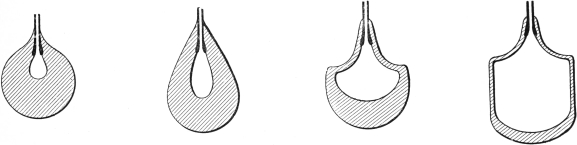 Quite apart from the question of thermal endurance, the expansive properties of glass are of some importance. Thus when several kinds of glass have to be united, as, for example, in the process of producing “flashed” coloured glass, it is essential that their coefficients of expansion should be as nearly as possible the same; otherwise considerable stresses will be set up when the glasses, which have been joined at a red heat, are allowed to cool. On the other hand, this mutual stressing of two glasses owing to differences in their thermal expansion has been utilised for the production of tubes and other glass objects possessing26 special strength. If a tube be drawn out of glass consisting of two layers, one considerably more expansible than the other, and the cooling process be rightly conducted, it is possible to produce a tube in which both the inner and outer layers of glass are under a considerable compressive stress. Not only is glass, as we have seen above, enormously stronger as against compression than it is against tension, but glass under compressive stress behaves as though it were a much tougher material, being less liable to injury by scratches or blows. Moreover, if a tube in this condition be heated and then exposed to sudden cooling, the first effect of the application of cold will be a contraction of the surface layers, resulting in a relief of the initial condition of compression. These tubes are, therefore, remarkably indifferent to sudden cooling, although they are naturally more sensitive to sudden heating. In this respect they differ entirely from ordinary glass, which is considerably more sensitive to sudden cooling than to sudden heating, particularly when the heat or cold is applied to all the surfaces of the object at the same time. The special tubes made of two layers of glass above referred to are manufactured by the Jena Glass Works for special purposes, among which boiler gauge glasses are the most important. It should be also mentioned here that the remarkable thermal endurance of vitrified silica, which can be raised to a red heat and then immersed in cold water without risk of breakage, is chiefly due to its very low coefficient of expansion.