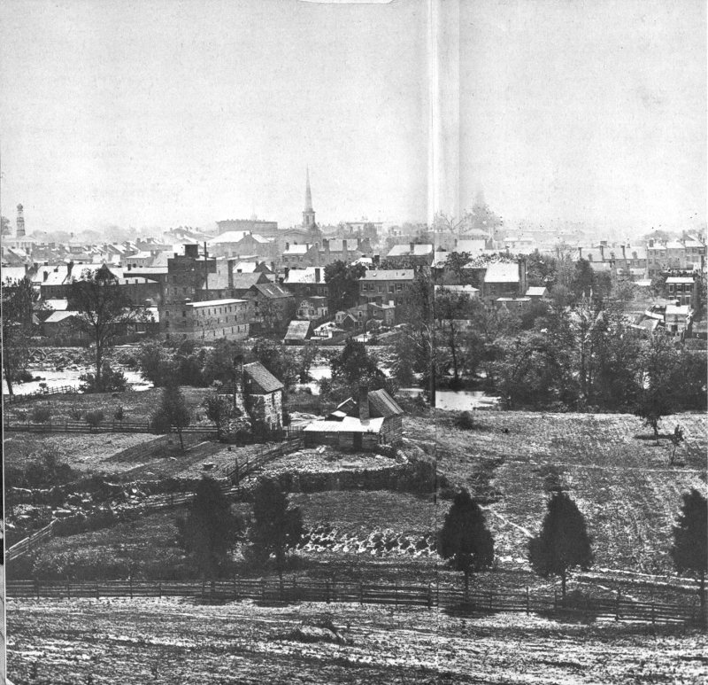In the final year of the Civil War in the East, the fighting focused upon Petersburg, an important transportation center for Richmond and Lee’s army. For 10 bloody months of combat, both from behind prepared positions and along the main routes of supply, Lee’s ragged Confederates held the city (shown here from north of the Appomattox River) against Grant’s numerically superior Federals. On April 2-3, 1865, Lee was forced to abandon both Petersburg and Richmond. One week later, he surrendered the Army of Northern Virginia at Appomattox Court House, dooming the South’s bid for independent existence.