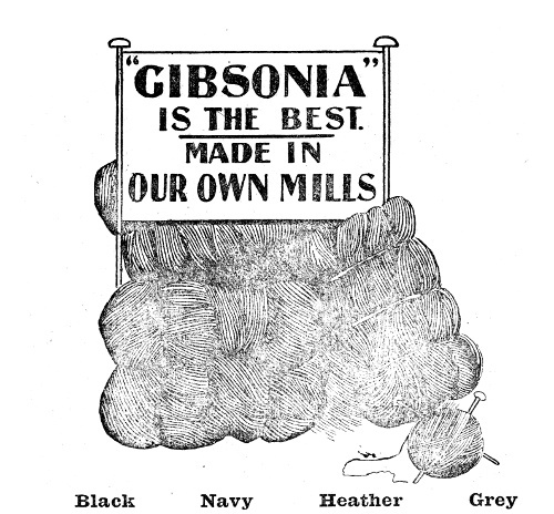 is “GIBSONIA” Knitting Wool, made from the finest Victorian Western District Wools entirely in our own mills. Every process in the manufacture of this yarn is under the supervision of an expert, and in every particular the product will be found equal to the best imported Wools. At present we are making only 4-Ply in Black, Navy, Grey and Heather. From 3½ to 4 skeins of this Wool are required to knit a pair of full size Men’s Socks, and when made no man could wish to wear better. The Yarn is also suitable for Children’s Garments, Ladies’ Jackets, Cap Comforters, and, in fact, any purpose to which Knitting Wool is applied.