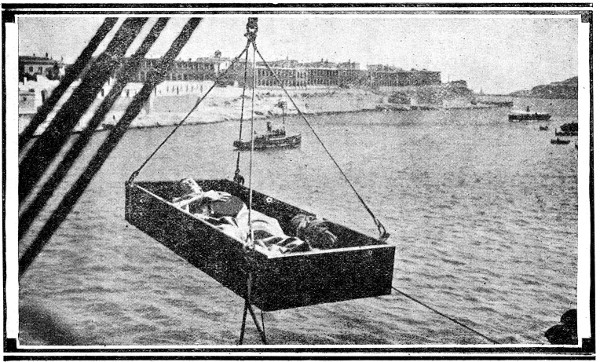 The military hospitals in and around Brisbane, the transports leaving for war zones, and the Australian divisions of the Red Cross in Egypt, England, France and other parts of Europe are supplemented with necessities from the Queensland division of the Red Cross. To the head-quarters in Adelaide Street there is a steady flow of consignments arriving from the suburban and country branches. These are unpacked in the receiving and distributing room on the basement and stored ready for the demands of the military authorities. When a requisition for a hospital or transport is received the articles are again packed and distributed: groceries, bandages, socks, shirts, pyjamas, magazines and the hundred and one articles required for the sick or wounded being arranged and consigned according to the requirements. One thousand 1lb. tins of dripping are sent monthly for the prisoners of war in Germany, in addition to tins of fruit, meat extracts, honey, rolled oats, tea, cheese and other groceries, £5,400 a month being spent by the Australian Red Cross Society for the prisoners of war alone.