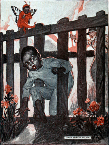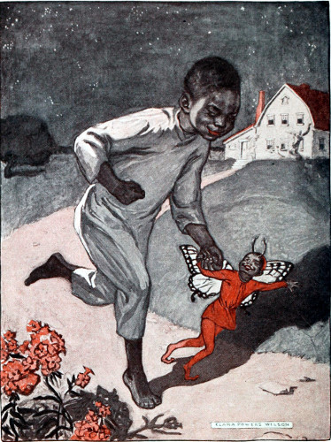 And Watermelon Pete listened to what the naughty little Blackie said, and then he crawled out of bed, and ran, oh, so fast, down to the fence, and scrooged through a hole in the fence, and ran—pitter-patter, with his little bare black 14 feet—down the path to the watermelon vines.