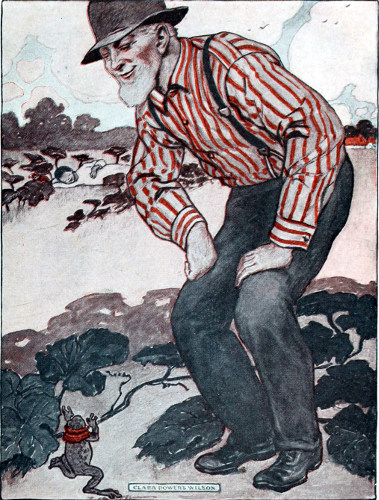 Then little Mrs. Hoppy Toad came out from under a burdock leaf where she lived, and said in her funny little way-up-high voice, “Farmer Brown, I know who ate your watermelons!”