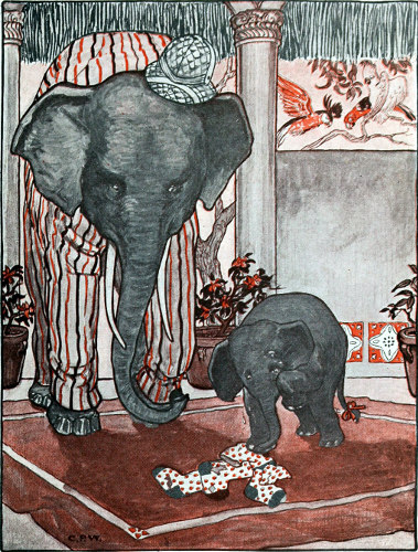 And Baby Elephant said, “Why, Daddy, I’ve worn my stockings all out, and I haven’t any more to put on.”