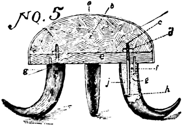 The cow hoof takes a high polish, and a number of useful articles can be made of them—which are not only useful, but quite a novelty. Take a pair of cow hoofs, which are neither bruised nor scaled, rasp them down in good shape, then scrape, sand-paper and polish the same as directed in polishing horns. The hoofs should be good matches, and both from the same 111foot. Bore or drill two holes in one of them on the inner side, about one-half inch apart, and place the two hoofs side by side on a level board, seeing that the toes are even with each other. Take a piece of wire or an awl and put through the holes in the hoof and mark the place to make the holes on the other, so that when they are wired together they will set even with each other. Drill small holes around the tops, say a quarter of an inch apart; take a piece of malleable wire of sufficient size and draw it through the holes in the sides of the hoofs, drawing them firmly together, and twist the ends of the wire together; this will hold them in place. Bind the upper edge of hoofs with piece of cloth, sewing through the holes drilled for that purpose. Stuff each hoof with tow or moss, and stuff with any goods to suit your fancy, silk plush, velvet, etc. Put the filling in tight and let it come 112above the level of hoof to make the cover rounding, then drawn down tight. Draw the edges of the cover down and sew them with a strong thread to the binding. Take a piece of fancy cord or ribbon and tack it around the edge of the cover and you have a fancy pin cushion. To make a match safe or tooth-pick case, polish the hoofs, wire together, and drill the holes around the edge as before; then take some glue and spread it well over the inside of each hoof; cut some red flannel to fit the inside and press it in with your fingers until it is all smooth; cut it off at the edge of top of hoof, and bind the edges with ribbon. This makes a very pretty match safe or tooth-pick case. All hoofs are polished in the same manner. Should the hoofs not set level after they are put together, take a coarse piece of sand-paper and tack or hold it on a level board, set the bottom of the hoofs on it and rub round and 113round until they do set level. It would be best to attend to this as soon as they are fastened together.