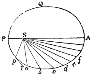 A planet moves in its elliptical orbit with a velocity varying every instant, in consequence of two forces, one tending to the centre of the sun, and the other in the direction of a tangent (N. 38) to its orbit, arising from the primitive impulse given at the time when it was launched into space. Should the force in the tangent cease, the planet would fall to the sun by its gravity. Were the sun not to attract it, the planet would fly off in the tangent. Thus, when the planet is at the point of its orbit farthest from the sun, his action overcomes the planet’s velocity, and brings it towards him with such an accelerated motion, that at last it overcomes the sun’s attraction, and, shooting past him, gradually decreases in velocity until it arrives at the most distant point, where the sun’s attraction again prevails (N. 39). In this motion the radii vectores (N. 40), or imaginary lines joining the centres of the sun and the planets, pass over equal areas or spaces in equal times (N. 41).