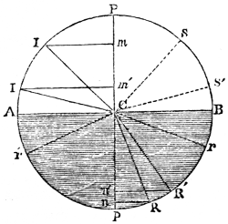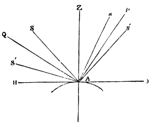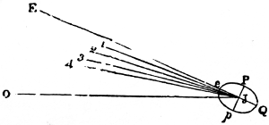Objects appear to be situate in the direction of the rays which proceed from them. Were light propagated instantaneously, every object, whether at rest or in motion, would appear in the direction of these rays; but, as light takes some time to travel, we see Jupiter in conjunction, by means of rays that left him 16m 26s·6 before; but, during that time, we have changed our position, in consequence of the motion of the earth in its orbit: we therefore refer Jupiter to a place in which he is not. His true position is in the diagonal (N. 97) of the parallelogram, whose sides are in the ratio of the velocity of light to the velocity of the earth in its orbit, which is as 192,000 to 19, or nearly as 10,000 to 1. In consequence of the aberration of light, the heavenly bodies seem to be in places in which they are not. In fact, if the earth were at rest, rays from a star would pass along the axis of a telescope directed to it; but, if the earth were to begin to move in its orbit with its usual velocity, these rays would strike against the side of the tube; it would, therefore, be necessary to incline the telescope a little, in order to see the star. The angle contained between the axis of the telescope and a line drawn to the true place of the star is its aberration, which varies in quantity and direction in different parts of the earth’s orbit; but, as it is only 20ʺ·481, it is insensible in ordinary cases (N. 98).