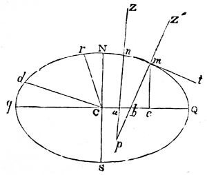 It has been proved by Newton, that a particle of matter (N. 6) placed without the surface of a hollow sphere (N. 7) is attracted by it in the same manner as if the mass of the hollow sphere, or the whole matter it contains, were collected into one dense particle in its centre. The same is therefore true of a solid sphere, which may be supposed to consist of an infinite number of concentric hollow spheres (N. 8). This, however, is not the case with a spheroid (N. 9); but the celestial bodies are so nearly spherical, and at such remote distances from one another, that they attract and are attracted as if each were condensed into a single particle situate in its centre of gravity (N. 10)—a circumstance which greatly facilitates the investigation of their motions.
