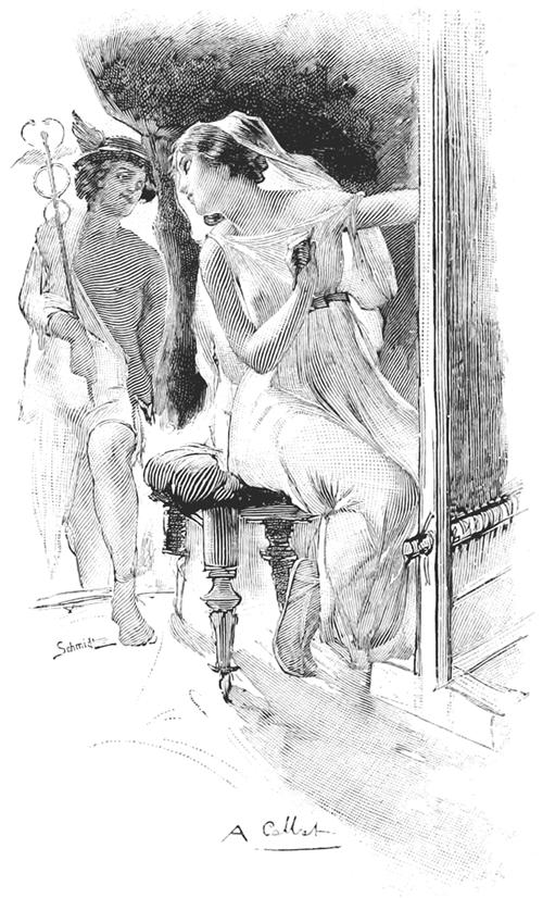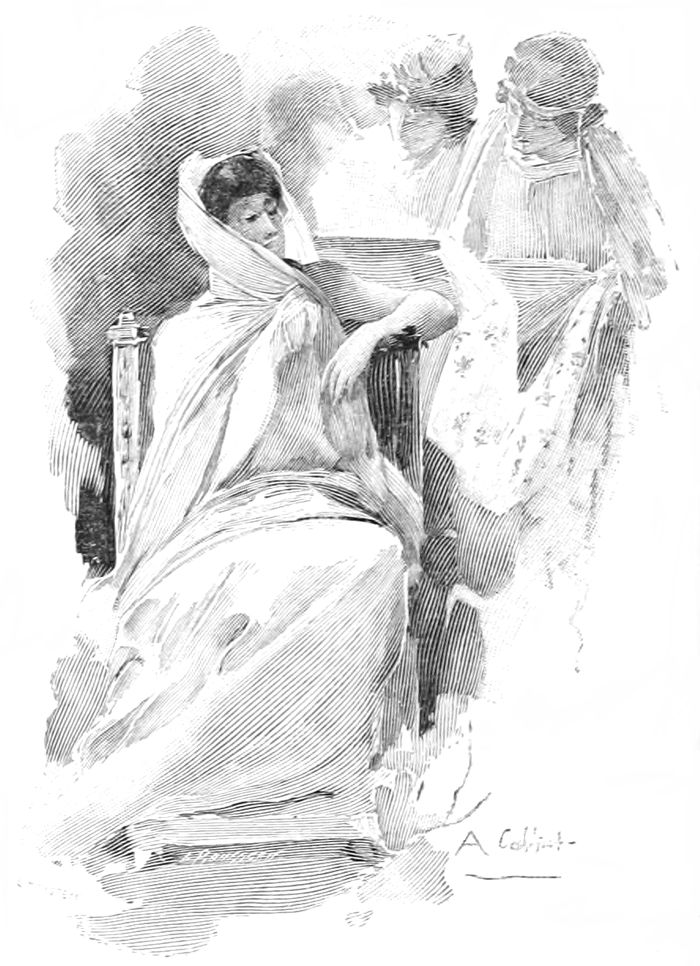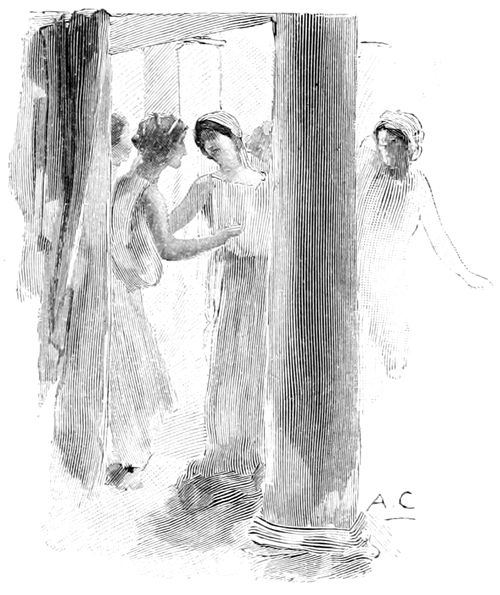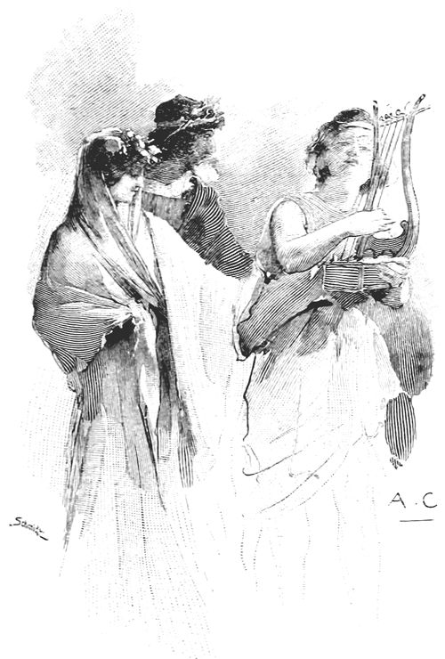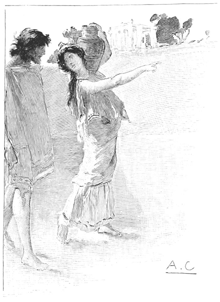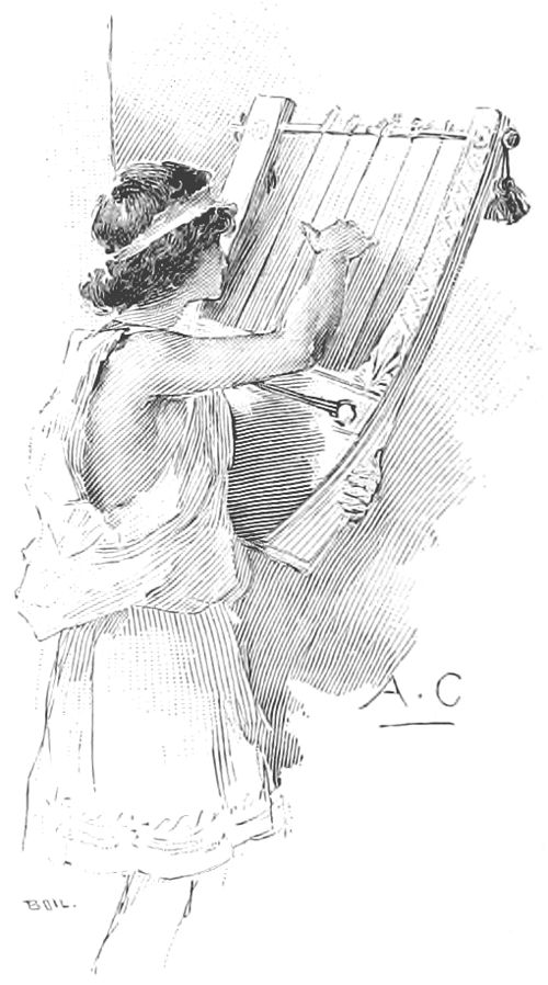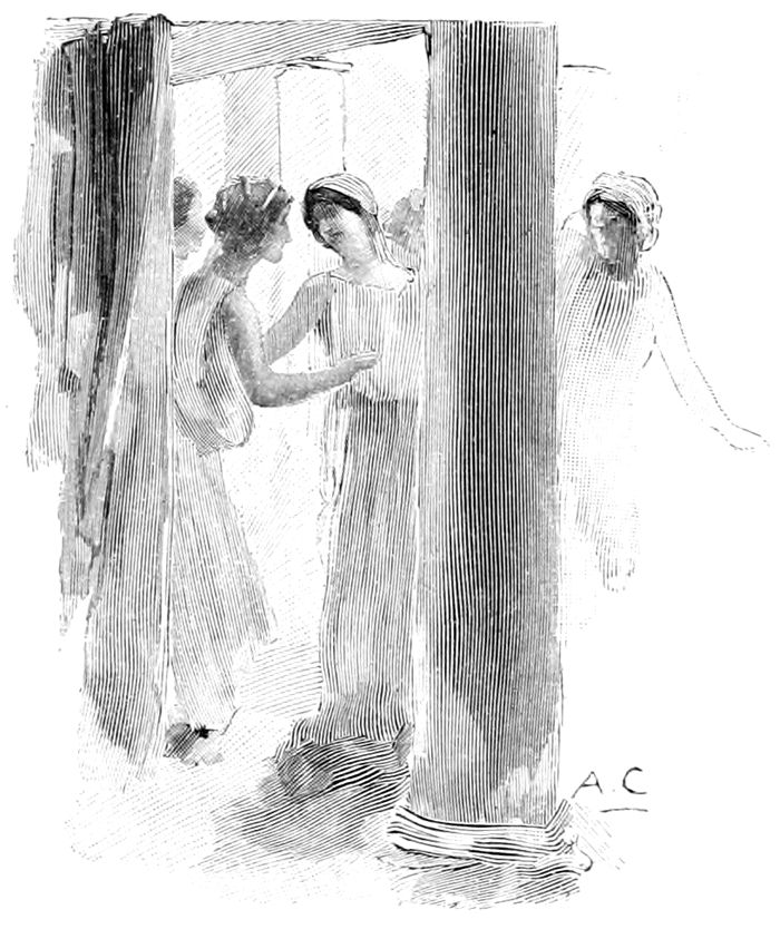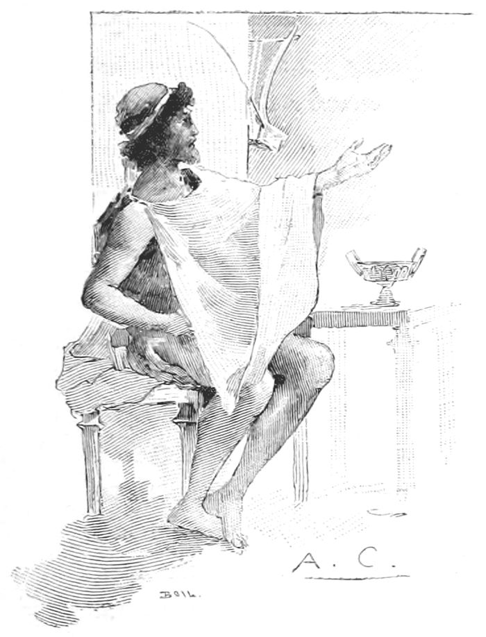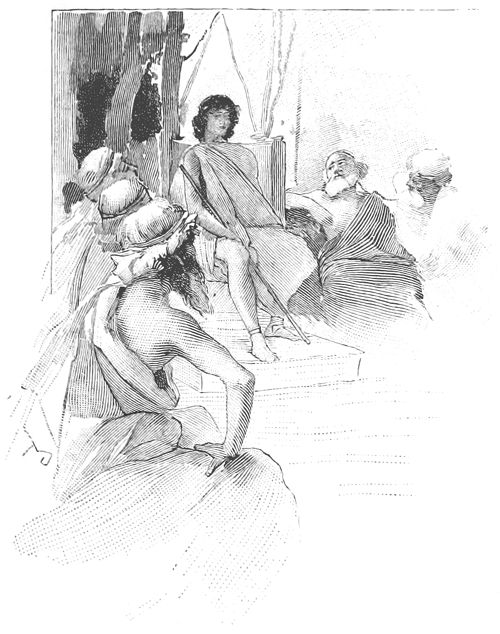 Alors entrèrent les prétendants superbes; les hérauts leur versèrent 7 l'eau sur les mains; des servantes servirent le pain et des serviteurs remplirent les cratères.—La faim et la soif apaisées, un héraut mit une lyre aux mains de Phémios et tandis qu'il préludait, par contrainte, devant les prétendants, Télémaque dit bas à Minerve: