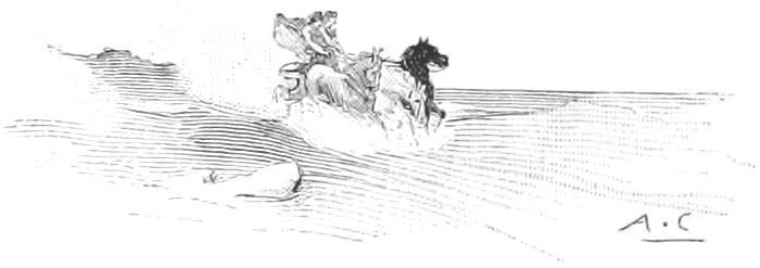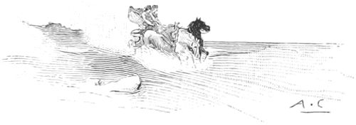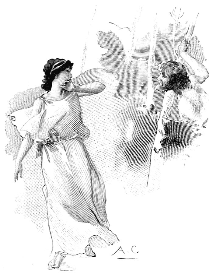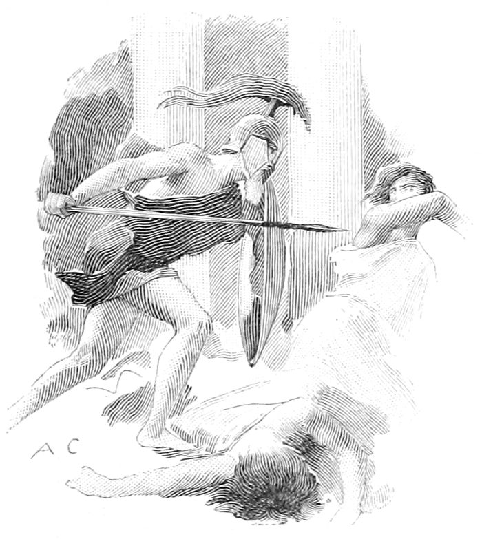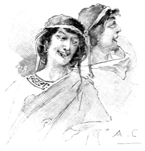 Elle dit et attachant ses belles sandales d'or et d'ambroisie, elle partit sur le souffle des vents et s'arrêta devant la porte du palais d'Ulysse, prenant la figure de Mentès, chef des Taphiens. Là, sont les fiers prétendants réjouissant leur cœur; les serviteurs empressés versent le vin dans les cratères et découpent des viandes en abondance.