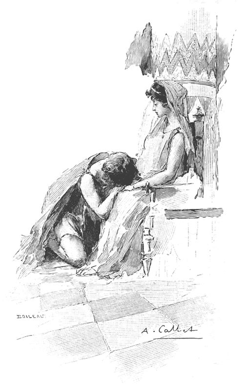 Cependant les prétendants orgueilleux remplissaient de leur tumulte le sombre palais; tous brûlaient d'amour pour la chaste épouse d'Ulysse, et souhaitaient partager sa couche divine. Le sage Télémaque, outré de leur audace, leur dit ces paroles rapides: