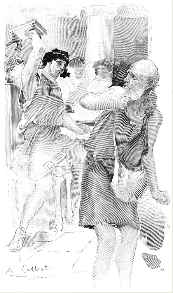 Il dit et retira sa main. Dans le palais les prétendants préparaient leur festin; tous riaient et tenaient des propos injurieux, l'un d'eux parlait ainsi: