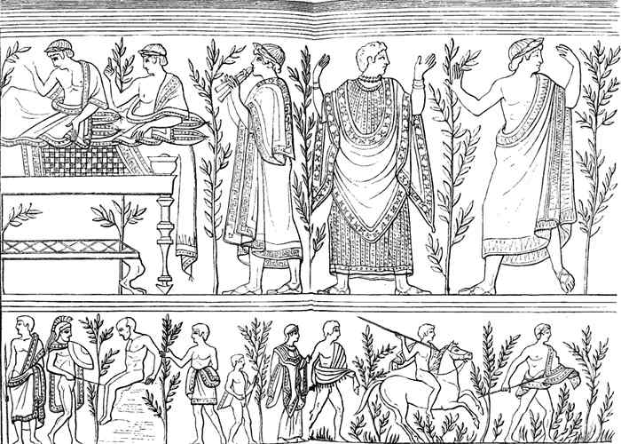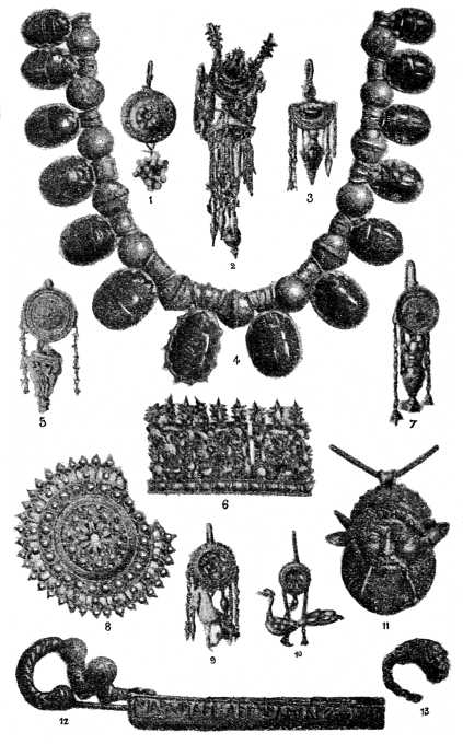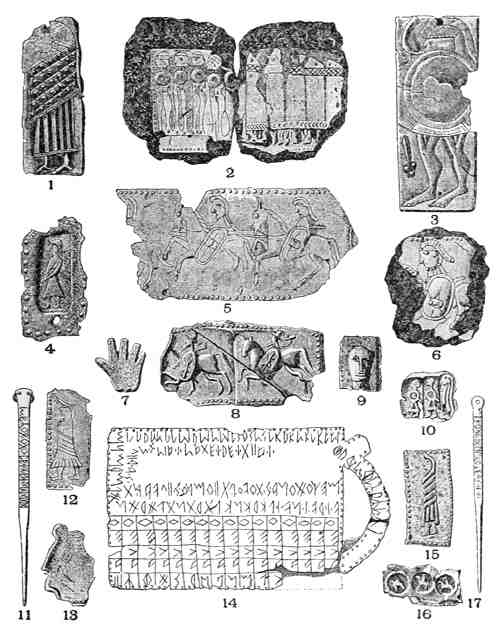 116. Le tombe prenestine sono abbondanti di ciste e d'oggetti d'ornamento muliebre. Fra le varie ciste una per la rappresentazione sua singolarmente importante è quella in cui pare raffigurata l'unione di Enea con Lavinia, onde sarebbe indicata la piena e diffusa esistenza della leggenda già nel VI secolo di Roma. Degli oggetti di toletta muliebre contenuti nelle ciste molti sono orientali, cioè vasetti d'alabastro, smalti, oreficerie, e provano le relazioni commerciali che fra il Lazio e i paesi transmarini erano mantenute da mercanti fenicî.