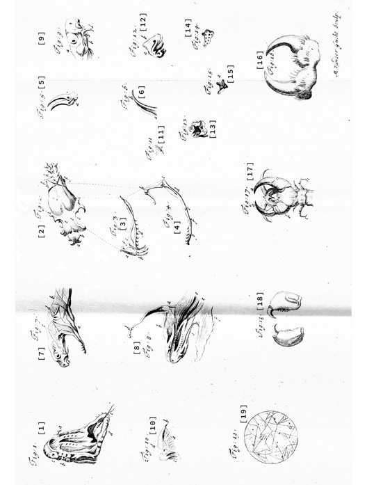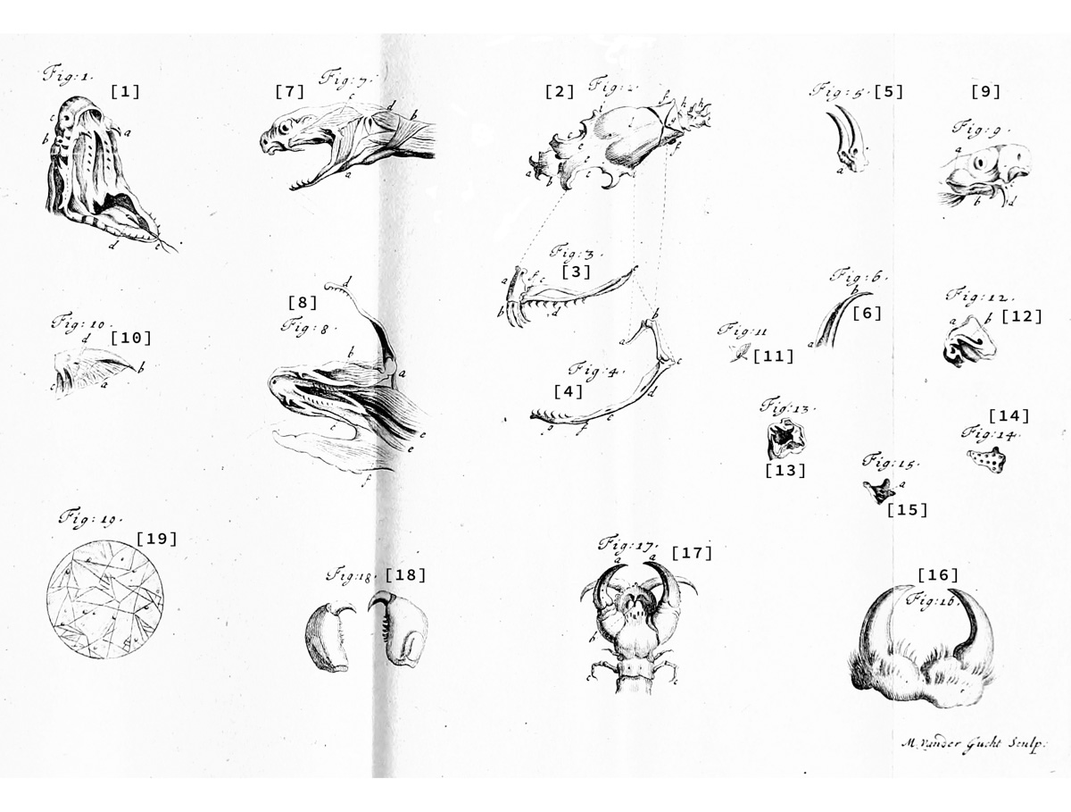 To begin therefore with the Head. The Skull (Fig. 2.) is composed of several Bones, joined together by Sutures, as in Man, but with this Difference, that the Os Frontis in the Viper consists of Two Bones united by a Rectilinear Suture, and the Parietal Bones are entire; whereas in Man the Parietal Bones have Sutures, and the Os Frontis is entire.