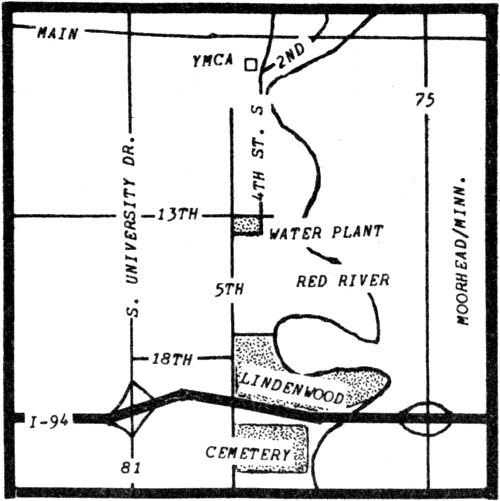 Probably the best place along the river is Lindenwood Park, which can be reached in several ways. Coming from the east, take Interstate 94 west from Moorhead, Minnesota. Turn right on the first exit after crossing into North Dakota. This leads onto South University Drive. Stay in the far right lane and turn right at the first signal light onto 18th Avenue South. Go one block to the park entrance.