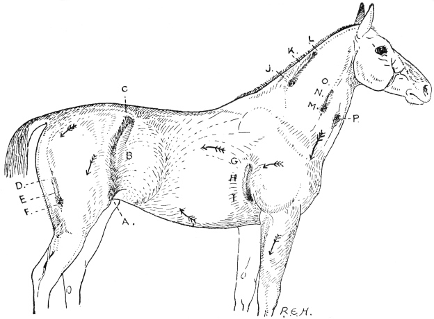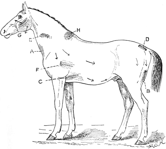 Fig. 50.—Side view of domestic horse, showing eight areas of reversed hair, A, B, C, D, E, F, G, H, all of which were situated under portions of the harness.