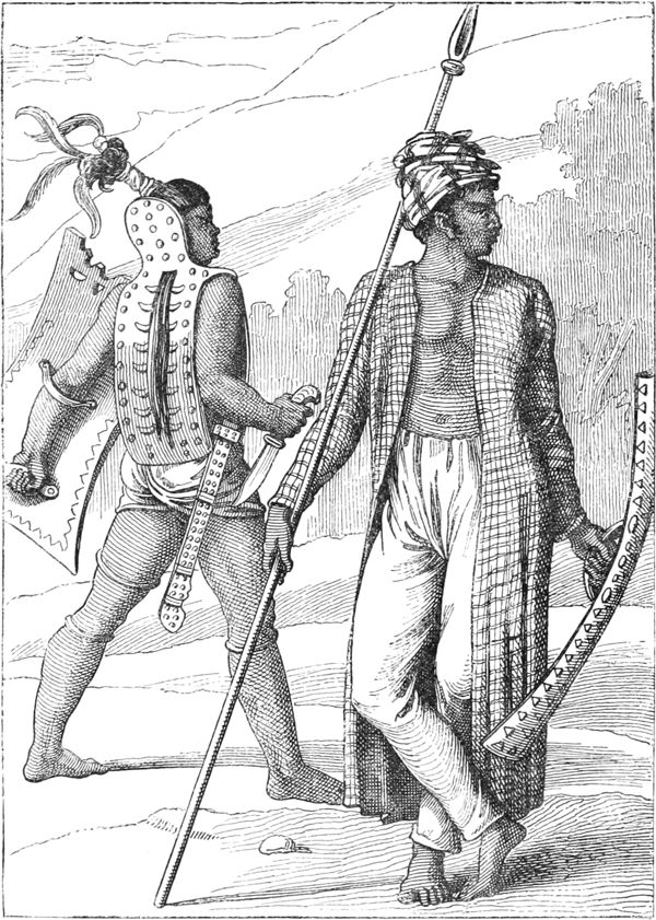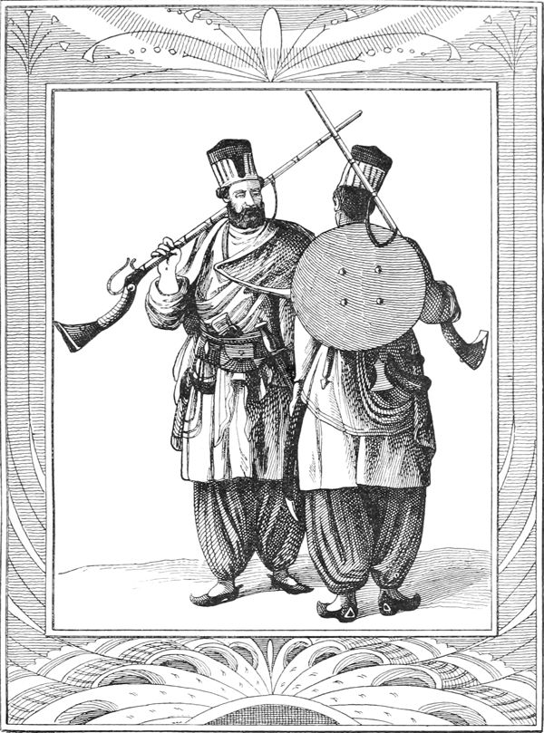 Guerriers Béloutchistans.—D'après Pottinger. Voyage dans le Béloutchistan et le Sindhy... traduit par Eyriès.—Paris, Gide, 1818, 2 vol. in-8.