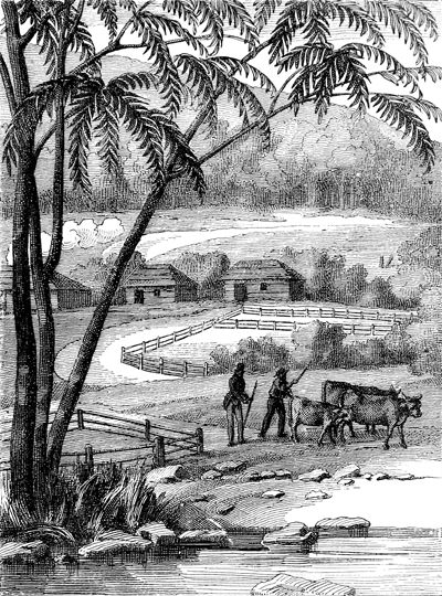 Ferme australienne.—D'après Freycinet. Op. et loc. cit. Pl. 98.