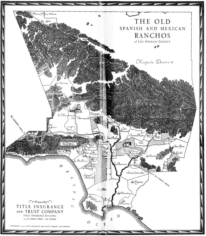 The Spaniards blessed their ranchos by dedicating them to Santa Anita, San Rafael, Santa Gertrudes, or San Geronimo. They saw the many little streams of water flowing from the springs on what is now Beverly Hills and named that Rancho Rodeo de las Aguas—the gathering of the waters. They loved the big oaks of the district along Ventura Boulevard between North Hollywood and Girard and named it Rancho El Encino—the oaks. What the Americans call the Baldwin Hills—they saw naturally formed a pass resembling scissors and thus was named Rancho Cienega o’Paso de La Tijera.