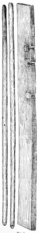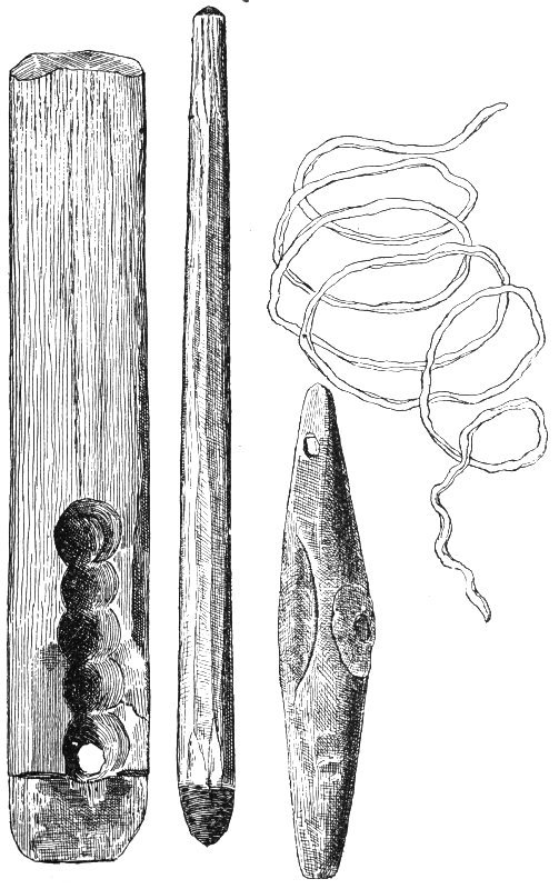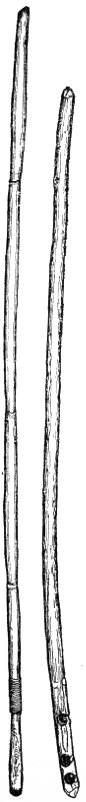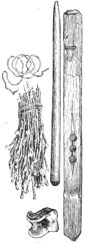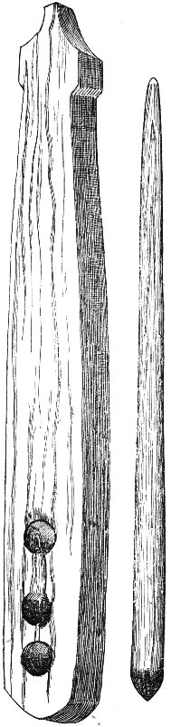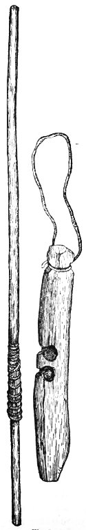 Fire is easily procured with this set. It takes but a slight effort to cause a wreath of aromatic smoke to curl up, and the friction easily grinds off a dark powder, which collects between the edges of the slot. When this ignites it drops down the slot in a little pellet, and falls upon the tinder placed below to receive it. Both drill and hearth are 18 inches long.
