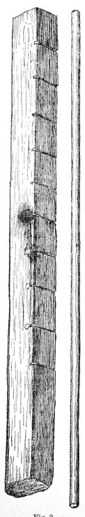 Going southward from Sitka the next fire-making set in the series is from Bella-Bella, British Columbia. These Indians are of the Salishan stock, and are called Bilhulas. The horizontal is a piece of cedar wood dressed square on three faces. It is apparently a piece of an oar or spear handle. The fire holes are shallow, and the fire slots are quite narrow (fig. 2). The drills have been scored longitudinally near the rubbing end; this may be a device to cause the wood to wear away more rapidly, and furnish fuel to the incipient fire. Fire has evidently been made with this set. Both parts are 1½ feet long; the drill is much thinner than that of Sitka. The tinder is of frayed cedar bark.