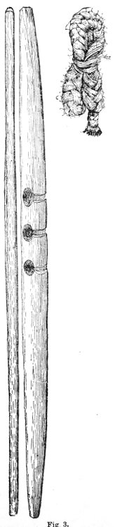 From a southern family of the Salishan stock, called the Quinaielt Indians, of Washington Territory, the museum has a complete set collected by the late Charles Willoughby. It consists of a hearth, two drills, and a slow-match. The hearth is a rounded piece of cedar wood; opposite the fire-holes it is dressed flat, so as to rest firmly on the ground. There are three fire-holes with wide notches. The drills taper to each end, that is, are larger in the middle (fig. 3). The powder, a fine brown dust, collects at the junction of the slot and fire-hole, where they form a lip and there readily ignites. This side of the hearth is semi-decayed. No doubt the slots were cut in that side for the purpose of utilizing this quality. The drills are bulged toward the middle, thereby rendering it possible to give great pressure and at the same time rapid rotation without allowing the hands to slip down too rapidly, a fault in many fire-drills. The slow-match is of frayed cedar bark, about a yard long, folded squarely together, and used section by section. Mr. Willoughby says: