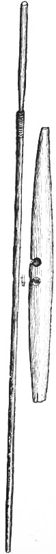 The Klamaths, of Oregon, of the Lutuamian stock, use a fire apparatus that looks very much like that of the Utes. The hearth is a rounded piece of soft wood thinned down at the ends (fig. 4). The drill is a long, round arrow-stick, with a hard-wood point set in with resin and served with sinew (see Ute drill, fig. 7). The holes in this hearth are very small, being less than three-eighths of an inch in diameter. They are in the center, and the fire slot being cut into the rounded edge widens out below, so that the coal can drop down and get draught. The wood is quite soft, apparently being sap-wood of yew or cedar, while the drill-point is of the hardest wood obtainable. It is probable that sand is used on the drill. The hearth is 13 inches long, and the drill 26.