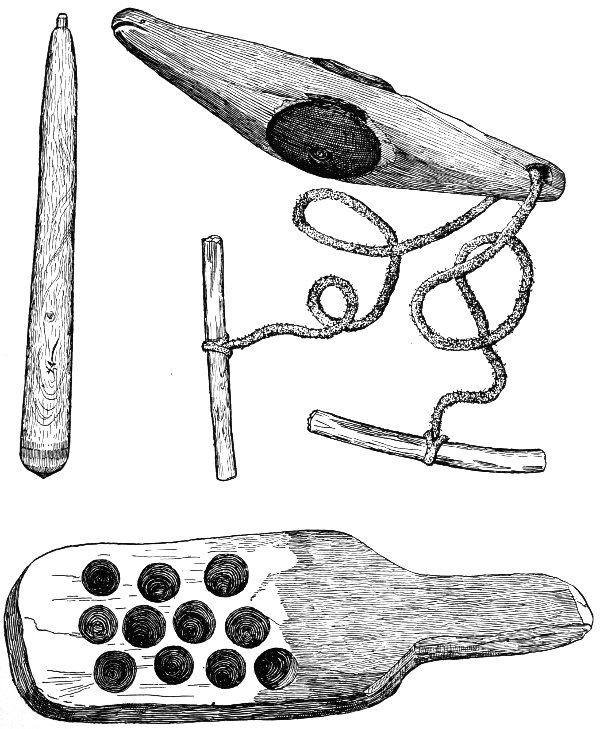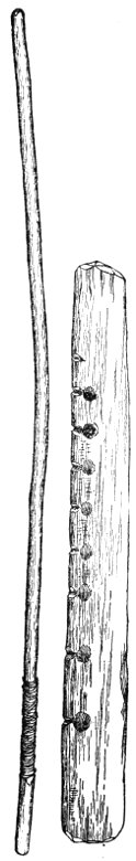 These sticks are two in number. One of them is held across the knees as they squat on the ground, and is about two feet long, made of a close-grained, brownish-yellow wood (perhaps pecan), half round in section; the flat face, which is held upward, is about an inch across. Three cylindrical holes about half an inch in diameter and of equal depth, the bottoms slightly concave, are made in it. The three holes are equally distant apart, about 2 inches, and the first one is the same distance from the end of the stick, which rests upon the right knee. In one of the holes is inserted the slightly-rounded end of a twirling stick made of a white, softer kind of wood, somewhat less than the diameter of the hole, so as to turn easily, and about 18 inches long.