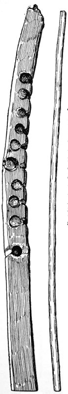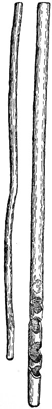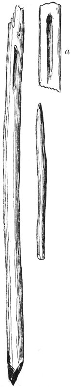 It has a better finish, and displays greater skill in its manufacture than the fire-tools of the neighboring tribes of Shoshonian (Utes) and 538 Moquelumnian stocks. In fact, it has a close affinity in appearance to those of the very near Athapascan (Hupa, etc.) stock. It is a matter of very great interest to compare with this a stick from the Mackenzie River. (See Fig. 28.) The resemblance is striking; it is as though one found a word of familiar sound and import in an unexpected place. The related tribes of the Indians dwelling on the Mackenzie have a wider range than the distance between the localities whence the respective sticks came; in fact, the Athapascans range about 50 degrees in latitude and the southern colonies of this great family are only about 250 miles southeast of the Washoans, while, as has been stated, the Hupas are quite near.