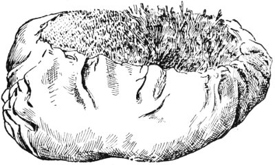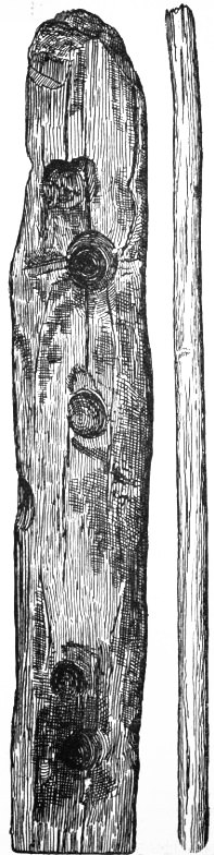 One of the rudest fire-making appliances in the Museum was collected by Prof. W. M. Gabb, at Talamanca, Costa Rica. The hearth is a rude billet of charred, black wood, resembling mahogany. It has central holes, with no gutter usually, though sometimes a shallow notch is cut on both sides of the fire-hole. The drill is a light branch, rather crooked, but dressed down roughly with a knife. Another hearth is of partly decayed, worm-eaten wood; with this a hard wood drill can be used, the hearth wasting away instead of the drill (fig. 16.) The absence of any fire slot, that is, the use of the central fire-hole, is worthy of notice in this locality. I have only observed its use in various parts of the Eskimo area, from East Greenland to Kadiak; outside of this range I have not noticed it anywhere else among the present tribes of the world. From descriptions 545 given it seems to have been practiced by the Caranchua Indians, a recently extinct tribe in Texas and Mexico. (See below.)