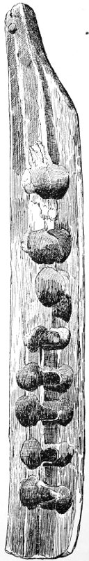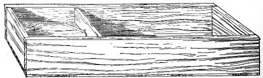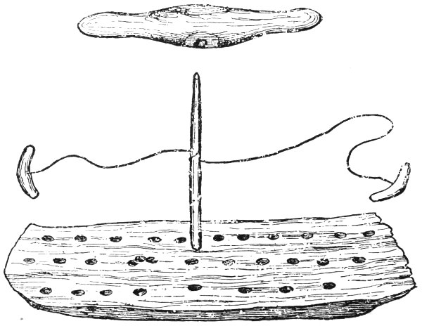 A piece of very hard and coarse, rough-grained wood, perhaps 8 inches in length, 2 in width, and three-fourths of an inch in thickness is procured. In one side of this and near one edge several holes are made, about one-half an inch in diameter by five-eighths of an inch in depth, rounded at the bottom, but left somewhat rough or very slightly corrugated. In the edge nearest these holes a corresponding number of smaller and tapering holes are made, opening by a small orifice into the bottom of each of the larger ones. These are made very smooth.