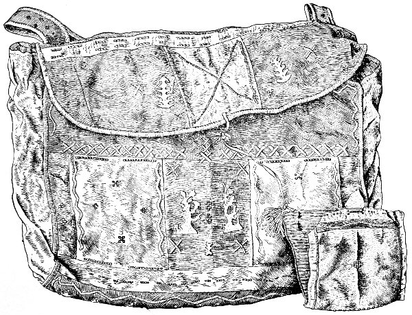 The Comanche Indian strike-a-light is a similar pouch to the one described, but much poorer in equipment (fig. 53.) A broken rasp, a piece of chert, and a piece of spunk, is enough for the purpose, and a bag made from a saddle skirt to hold them, completes the outfit.