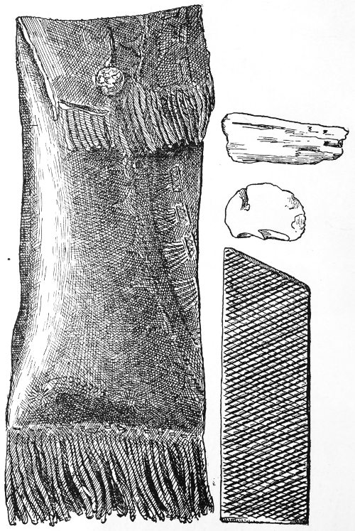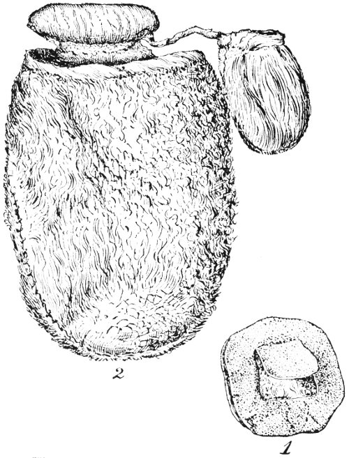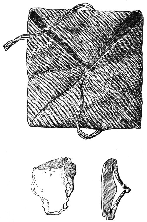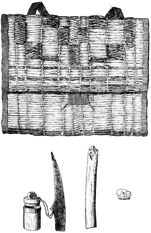 To strike a light the Aino takes out the cork with the steel attached and stirs up the tinder with the sharp point. He then holds up the flint in his hand over the box and strikes a spark down into it. He then transfers the coal to his pipe, or material for fire, or fire-stick, with the point of the steel. These articles are kept in a rush pouch of twined weaving. A much ruder pouch of fishskin is in the Museum.