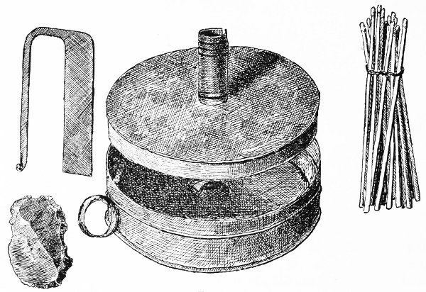 Fig. 57. Strike-a-light. Flint, steel, tinder-box, and rush-pouch.