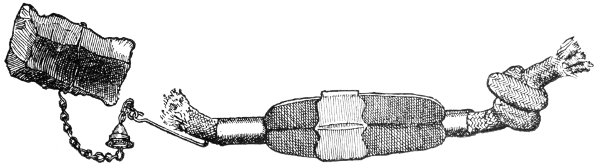 The Koords of Bhotan, Eastern Turkey, carry a pipe pouch containing besides flint, steel, and tinder, a pipe pick and a pair of pincers, 582 to transfer the lighted tinder to the pipe (fig. 55). The tinder is prepared from a fungus, probably polyporus species. The steel, shaped like an old-fashioned bell pull, is a very good form for holding in the hand.