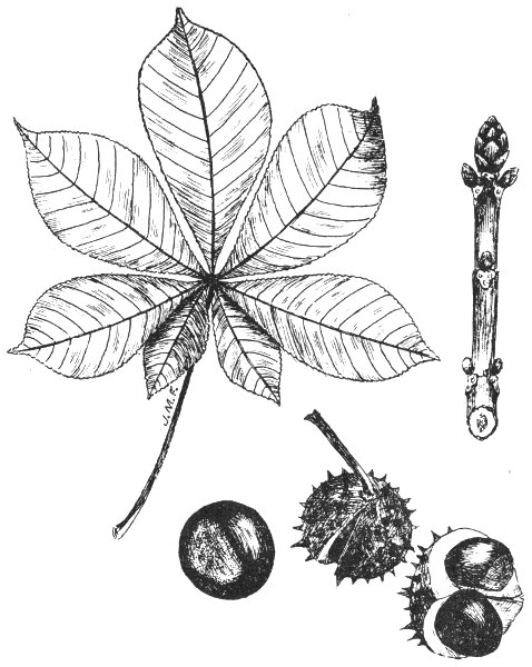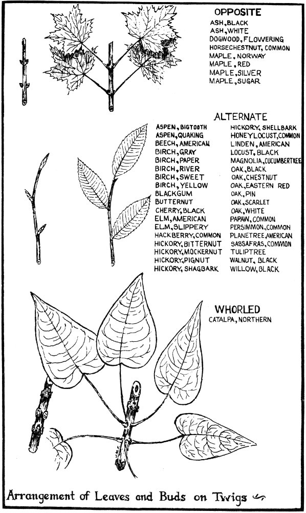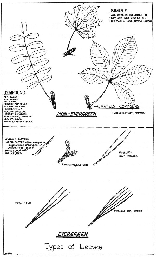 The first two plates (pages iv and v) show the types and arrangements of leaves. Outstanding features of individual trees are described in simplified wording and illustrated by accompanying sketches.