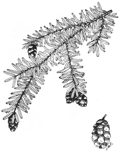 Leaves: Evergreen needles occur singly, spirally arranged on twigs but appear 2-ranked; flattened, about ½″ long; dark green, glossy and often grooved above: light green with 2 white lines below.