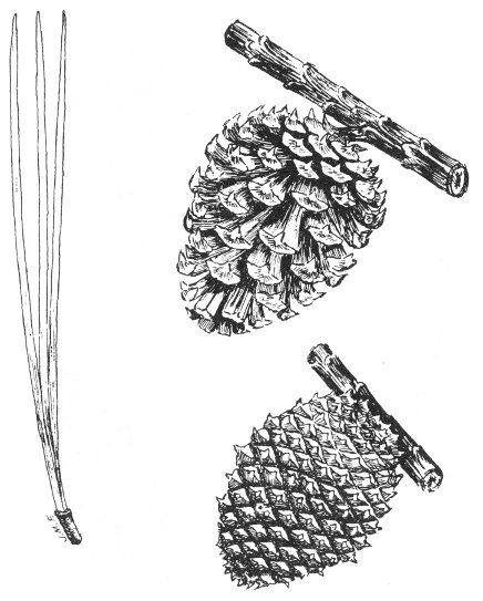 Leaves: Evergreen needles in clusters of 3, stiff, 2½″-5″ long, yellowish green.