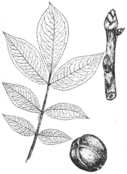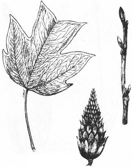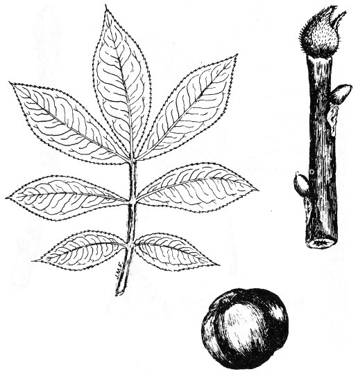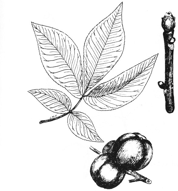 Twigs: Stout, brittle, rough, angled in cross-section, golden-brown. Buds egg-shaped, about ½″ long, resinous, red-brown.