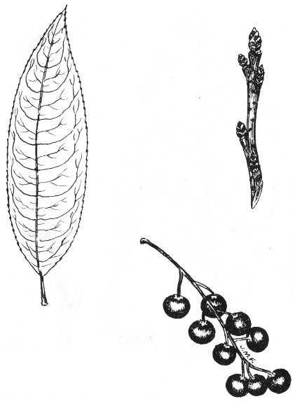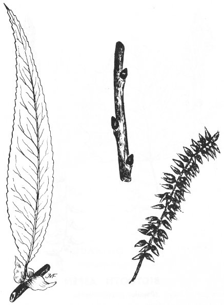 Twigs: Slender, curved, flexible, brown to purple with bluish white coating. Buds egg-shaped, usually less than ½″ long, brown, resinous.