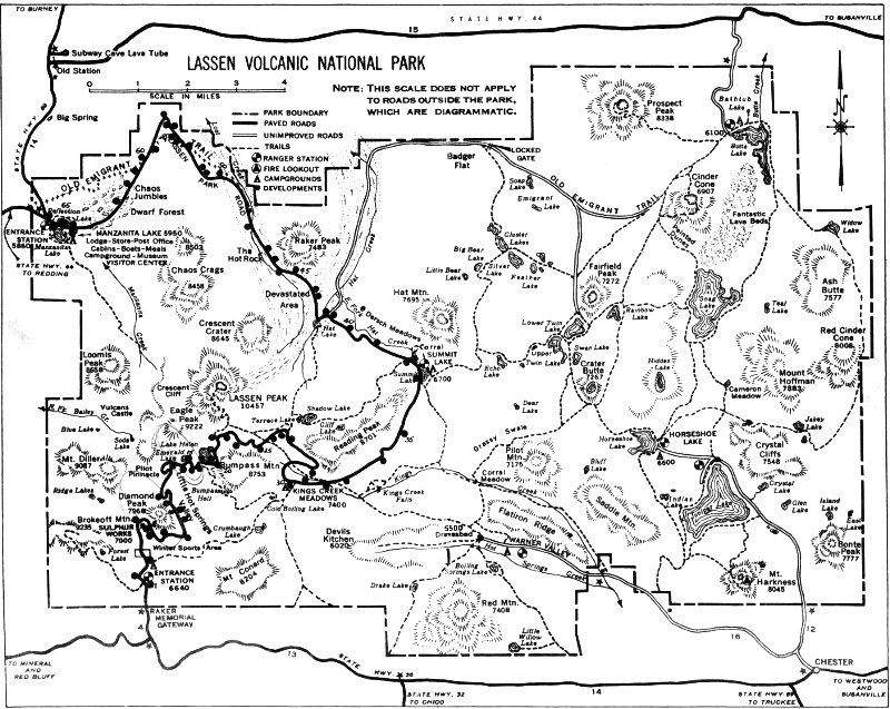 The Lassen Park Road is a link in State Route No. 89. It runs through Lassen Volcanic National Park, half circling the east side of Lassen Peak. This road was built by the National Park Service of the U. S. Department of the Interior to make accessible by car some of the finest scenery in the park. The road is not designed for high speed. The slower you drive the more you will see. Like you, others are sight seeing, so drive carefully and observe the warning signs at all times. Remember: an accident may ruin your vacation, your car, and even your life. Maximum speed is 45 miles per hour, but in many places this is excessive.