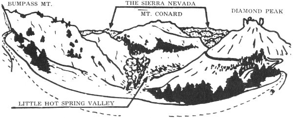 On the southeast horizon are the Sierra Nevada, with Childs Meadow closer in. To the north is the ragged top of Diamond Peak with a natural window through the rocks on the upper right near the skyline.