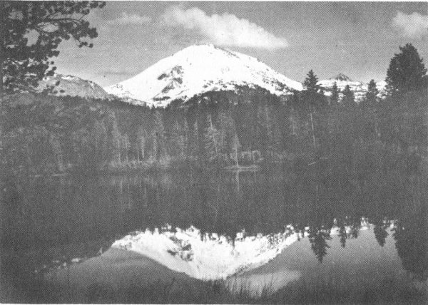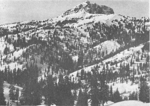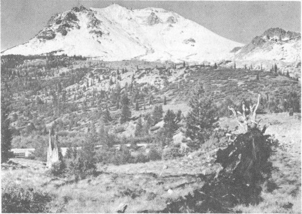 12 Rugged DIAMOND PEAK below, nearly encircled by Lassen Park Road, was named for the occurrence of occasional small, double-ended quartz crystals and diamond-shaped calcite crystals. These were deposited by hot volcanic waters that seeped through its already hardened lavas after volcanic eruptions had ceased. The mountain is the tough lava feeder, or core, of prehistoric Mount Tehama. Diamond Peak has resisted the sinking and weathering which reduced its surroundings.